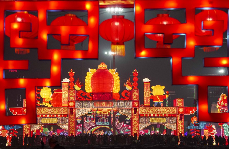 People visit a lantern show at the Xinjiang International Convention and Exhibition Center in Urumqi, northwest China's Xinjiang Uygur Autonomous Region, Jan. 1, 2022. (Xinhua/Hu Huhu)