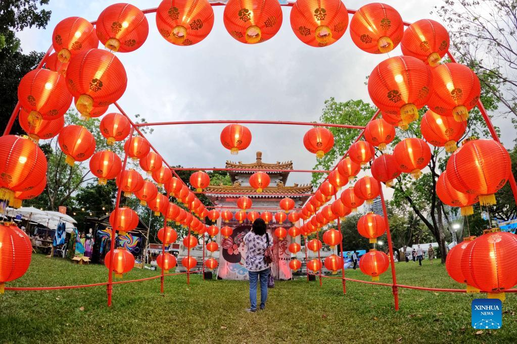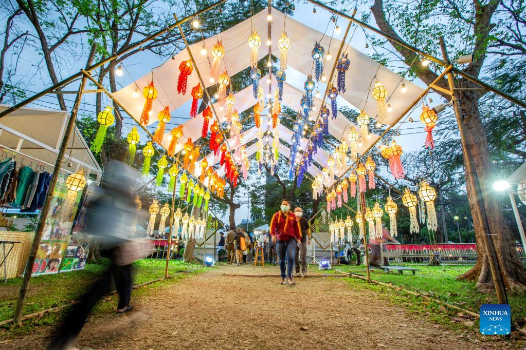 Tourists walk through a corridor decorated with lanterns during the 40th Thailand Tourism Festival at Lumpini Park in Bangkok, Thailand, Feb. 22, 2022. The Tourism Authority of Thailand (TAT) held the 40th Thailand Tourism Festival at Bangkok's Lumpini Park, showcasing famous landmarks, local customs, cultural heritage and local specialties from five regions of Thailand. (Xinhua/Wang Teng)