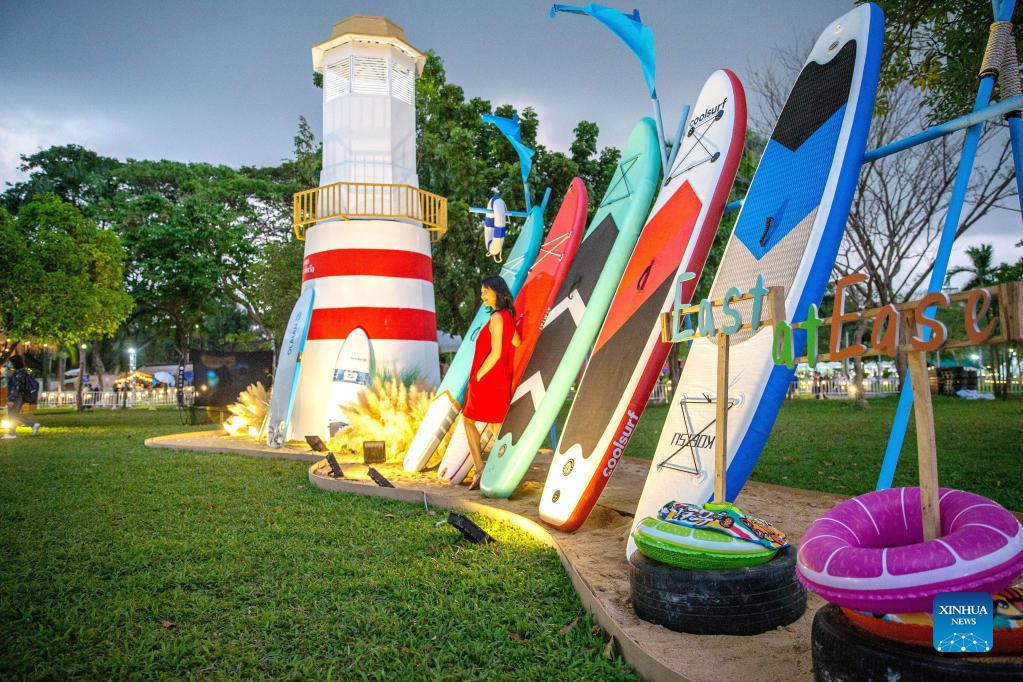 A visitor poses for photos with the miniature of a lighthouse during the 40th Thailand Tourism Festival at Lumpini Park in Bangkok, Thailand, Feb. 22, 2022. The Tourism Authority of Thailand (TAT) held the 40th Thailand Tourism Festival at Bangkok's Lumpini Park, showcasing famous landmarks, local customs, cultural heritage and local specialties from five regions of Thailand. (Xinhua/Wang Teng)