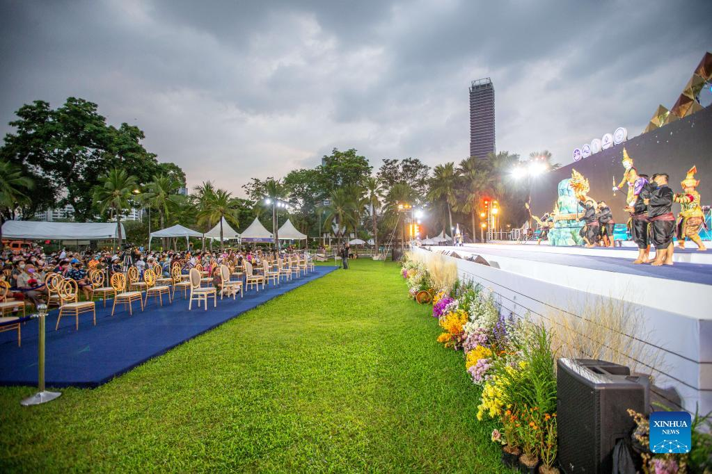 People watch a traditional Thai dance during the 40th Thailand Tourism Festival at Lumpini Park in Bangkok, Thailand, Feb. 22, 2022. The Tourism Authority of Thailand (TAT) held the 40th Thailand Tourism Festival at Bangkok's Lumpini Park, showcasing famous landmarks, local customs, cultural heritage and local specialties from five regions of Thailand. (Xinhua/Wang Teng)