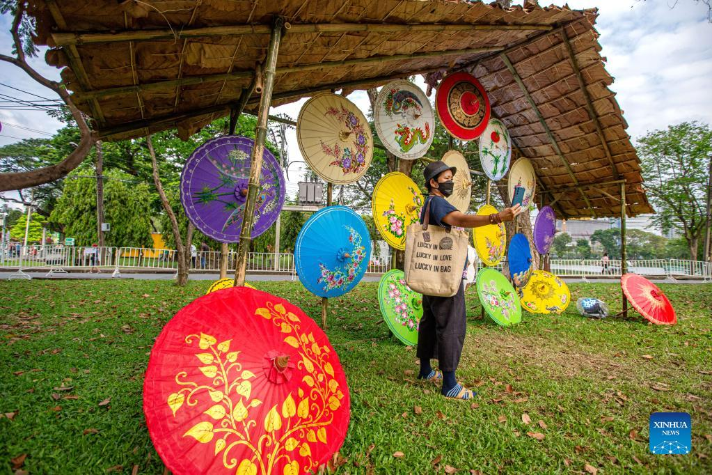 A visitor takes selfies with paper umbrellas during the 40th Thailand Tourism Festival at Lumpini Park in Bangkok, Thailand, Feb. 22, 2022. The Tourism Authority of Thailand (TAT) held the 40th Thailand Tourism Festival at Bangkok's Lumpini Park, showcasing famous landmarks, local customs, cultural heritage and local specialties from five regions of Thailand. (Xinhua/Wang Teng)