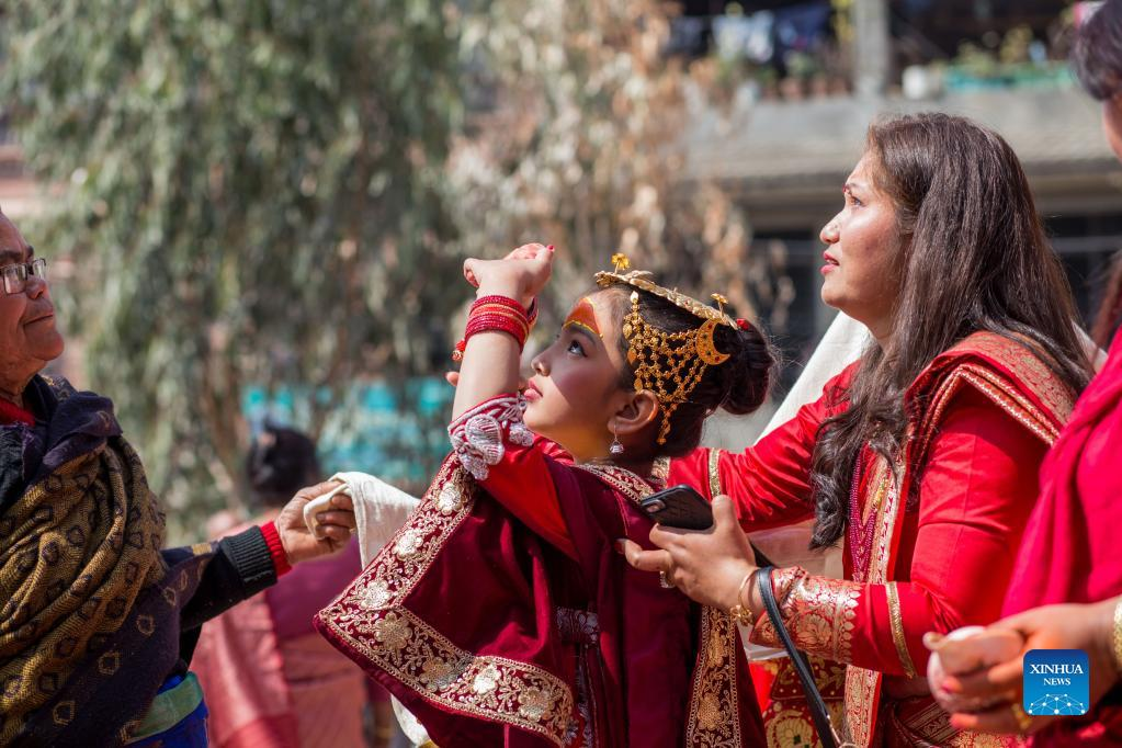 A girl worships the Sun during a puberty ceremony known as Gufa in Lalitpur, Nepal, Feb. 23, 2022. (Photo by Hari Maharjan/Xinhua)