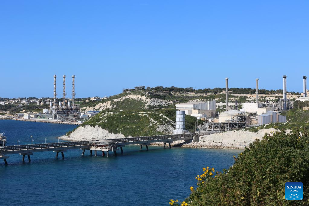 Photo taken on Feb. 23, 2022 shows a view of the Delimara power station in Marsaxlokk, southeastern Malta. The Delimara 3 (D3) power station, controlled and operated by China's Shanghai Electric Power (Malta) Holding Co., Ltd. (SEP), has played an important role in power supply in Malta, and emission reduction and air quality improvement in the areas around the power plant. The D3 station was turned from a heavy oil-fired power station into a gas-fired one by the SEP. (Xinhua/Chen Wenxian)