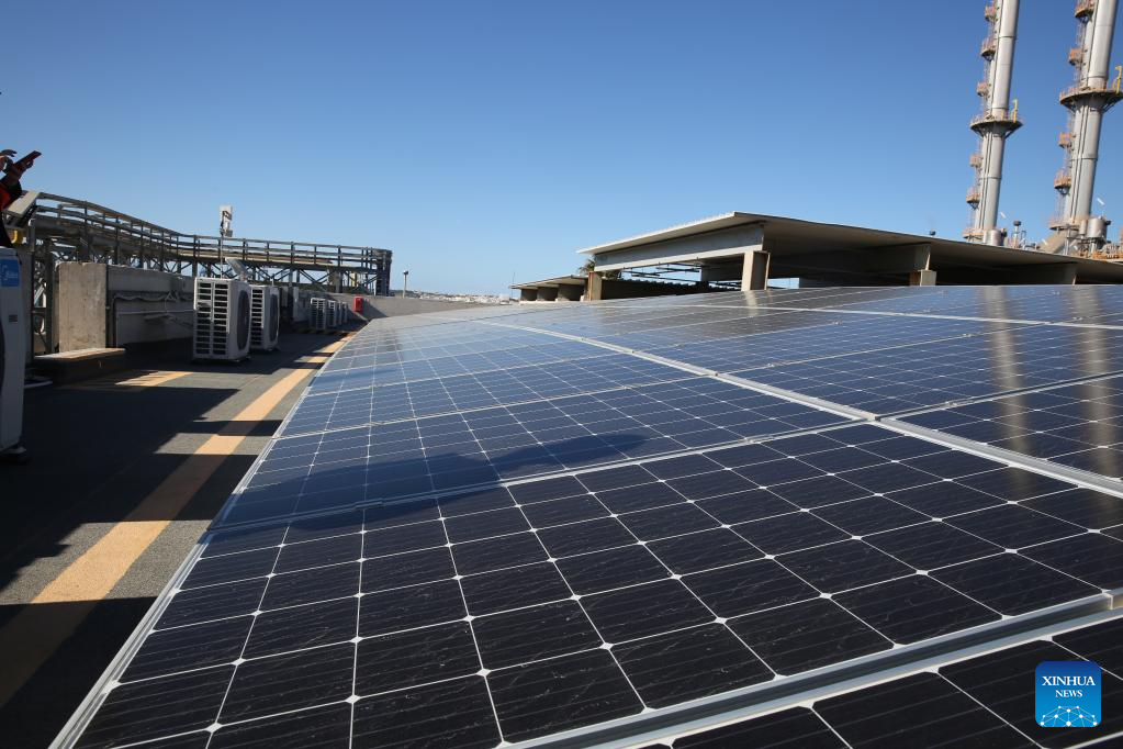 Photo taken on Feb. 23, 2022 shows a photovoltaic project in the Delimara 3 power station in Marsaxlokk, southeastern Malta. The Delimara 3 (D3) power station, controlled and operated by China's Shanghai Electric Power (Malta) Holding Co., Ltd. (SEP), has played an important role in power supply in Malta, and emission reduction and air quality improvement in the areas around the power plant. The D3 station was turned from a heavy oil-fired power station into a gas-fired one by the SEP. (Xinhua/Chen Wenxian)