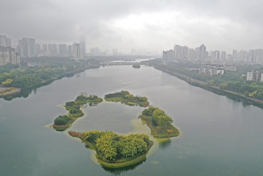 Aerial photo taken on Feb. 12, 2022 shows the Nanhu lake in rain and mist in Nanning, south China's Guangxi Zhuang Autonomous Region. (Xinhua/Zhou Hua)