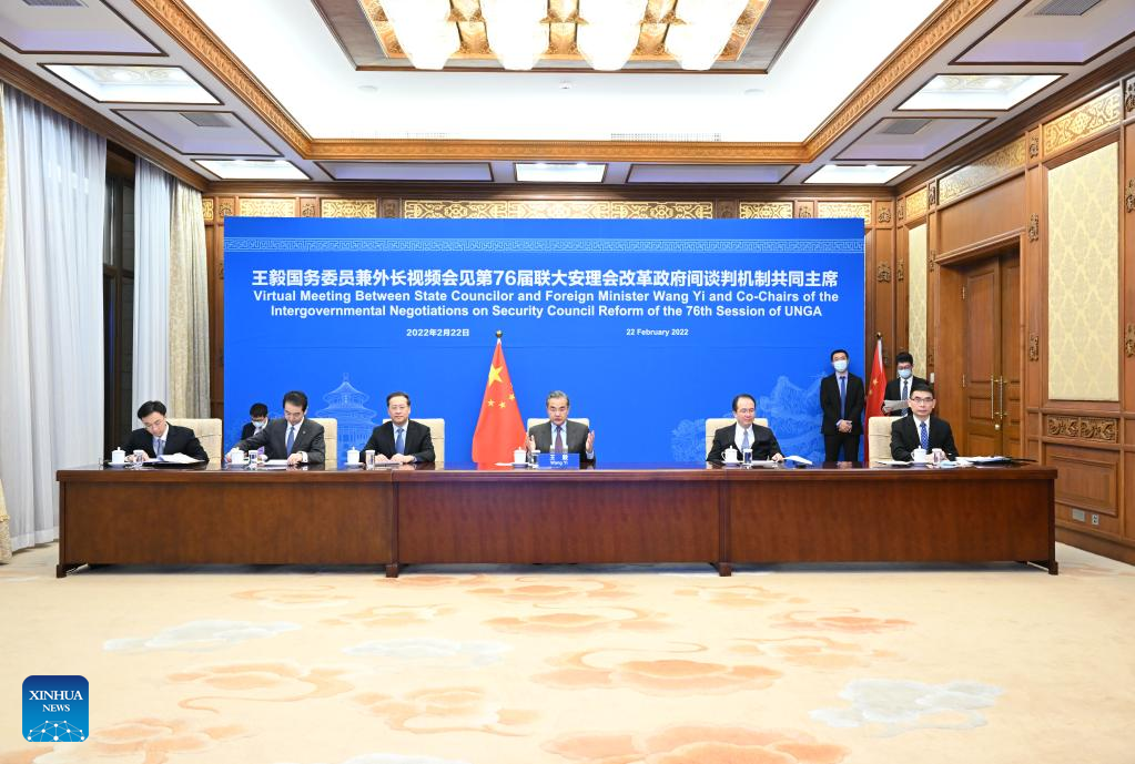 BEIJING, Feb. 23 (Xinhua) -- Chinese State Councilor and Foreign Minister Wang Yi met with Alya Ahmed Saif Al-Thani and Martin Bille Hermann, co-chairs of the Intergovernmental Negotiations (IGN) on the United Nations Security Council Reform of the 76th Session of the UN General Assembly, through video link Tuesday.