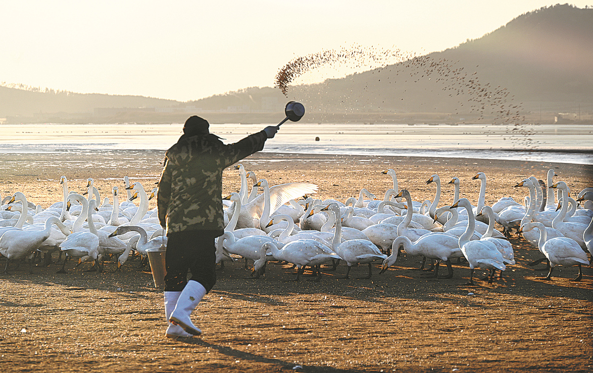 A worker feeds whooper swans wintering at the Rongcheng Swan National Nature Reserve in Rongcheng, Shandong province, on Wednesday. [Photo by YANG ZHILI/FOR CHINA DAILY]