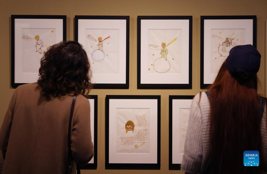 People visit the exhibition "A la Rencontre du Petit Prince" (Meet the Little Prince) at the Musee des Art Decoratifs de Paris, in Paris, France, Feb. 23, 2022. The exhibition features some 600 artworks by the French writer, designer and illustrator Antoine de Saint-Exupery, including the original manuscript for the first time exhibited in France. The exhibition runs from Feb. 17 to June 26, 2022. (Xinhua/Gao Jing)
