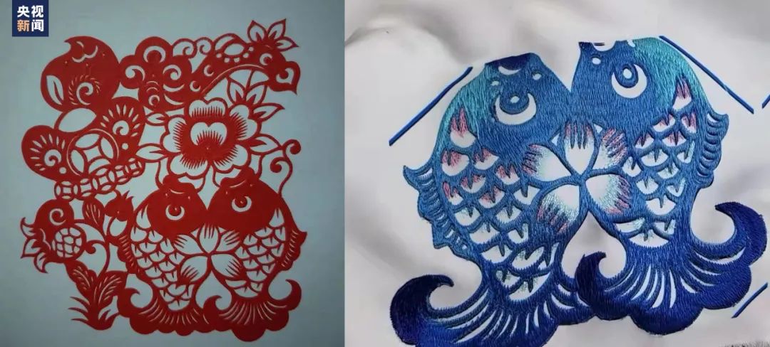 Combo photo shows a pattern of two fish (R) featured on clothes worn by the children’s choir during the closing ceremony of the Beijing 2022 Winter Olympic Games, Feb. 20, 2022, and a Yuxian paper-cutting work. (Photo/CCTV News)