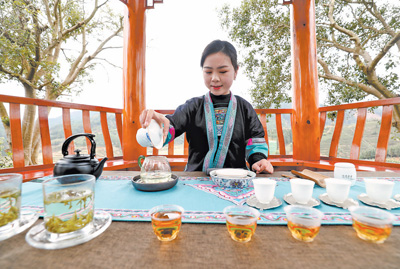 A lady of the Dong ethnic group performs traditional tea art in Guanghui village, Guyi town, Sanjiang Dong autonomous county, south China's Guangxi Zhuang Autonomous Region. (Photo/People's Daily)