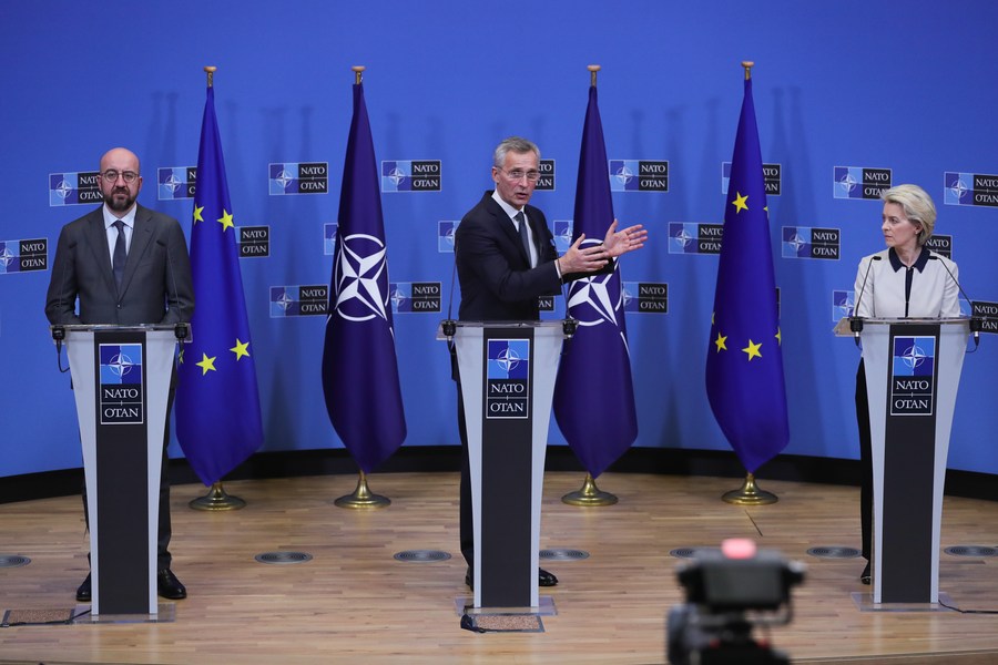Secretary-General of the North Atlantic Treaty Organization (NATO) Jens Stoltenberg (C), European Commission President Ursula von der Leyen (R) and European Council President Charles Michel attend a press conference at NATO headquarters in Brussels, Belgium, Feb. 24, 2022. (Xinhua/Zheng Huansong)
