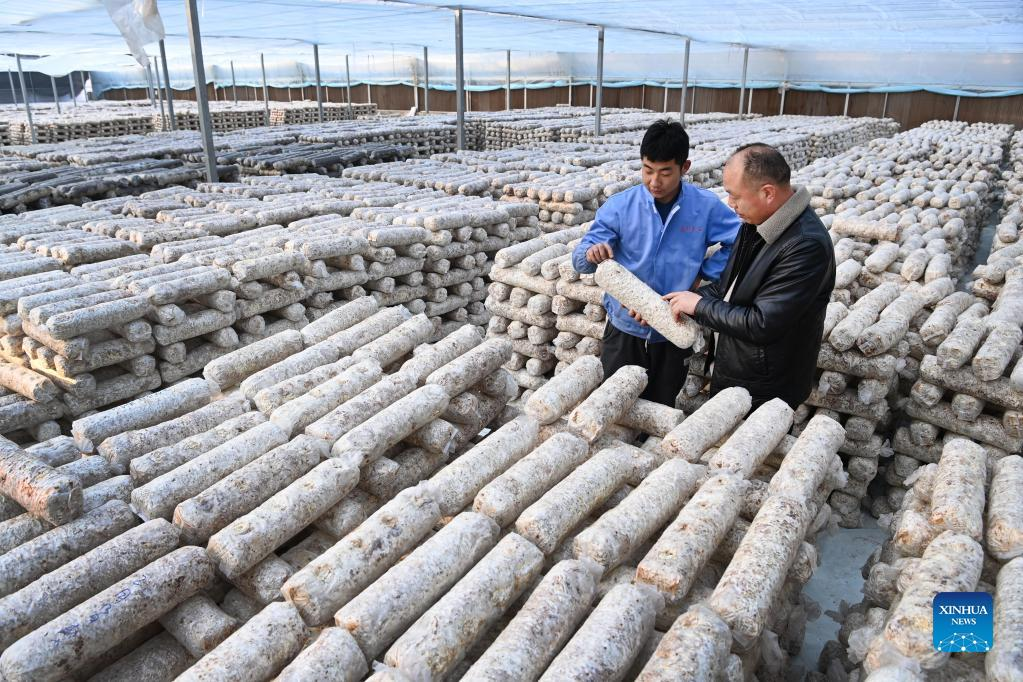 Workers examine edible fungi growing kits at an agricultural sci-tech company in Wuguanyi Township of Liuba County in Hanzhong, northwest China's Shaanxi Province, Feb. 24, 2022. Spring farming activities in Liuba County are underway with the help of modern agricultural facilities and technologies. (Xinhua/Tao Ming)