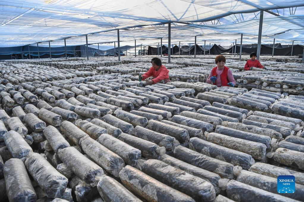 Workers produce edible fungi growing kits at an agricultural sci-tech company in Wuguanyi Township of Liuba County in Hanzhong, northwest China's Shaanxi Province, Feb. 24, 2022. Spring farming activities in Liuba County are underway with the help of modern agricultural facilities and technologies. (Xinhua/Tao Ming)