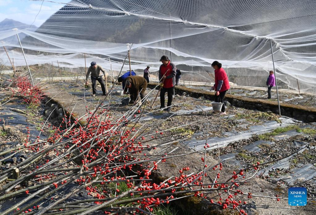 Villagers work at a flower cultivation base in Shaba Village of Liuba County in Hanzhong, northwest China's Shaanxi Province, Feb. 24, 2022. Spring farming activities in Liuba County are underway with the help of modern agricultural facilities and technologies. (Xinhua/Tao Ming)