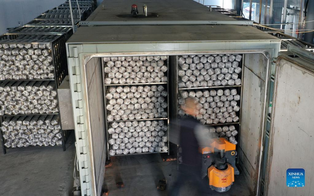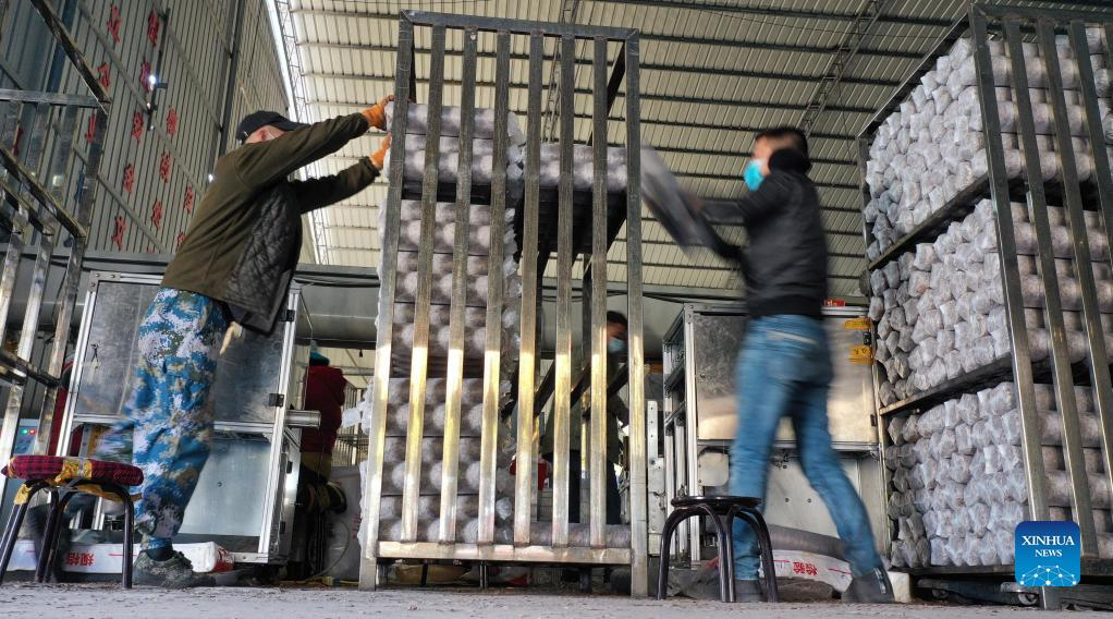 Worker pack edible fungi growing kits at an agricultural sci-tech company in Wuguanyi Township of Liuba County in Hanzhong, northwest China's Shaanxi Province, Feb. 24, 2022. Spring farming activities in Liuba County are underway with the help of modern agricultural facilities and technologies. (Xinhua/Tao Ming)