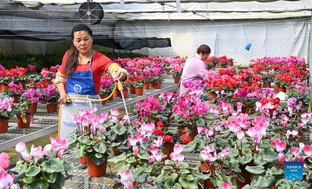 Employees water flowers at a flower cultivation base in Shaba Village of Liuba County in Hanzhong, northwest China's Shaanxi Province, Feb. 24, 2022. Spring farming activities in Liuba County are underway with the help of modern agricultural facilities and technologies. (Xinhua/Tao Ming)