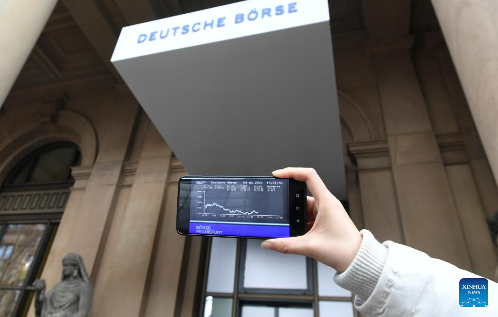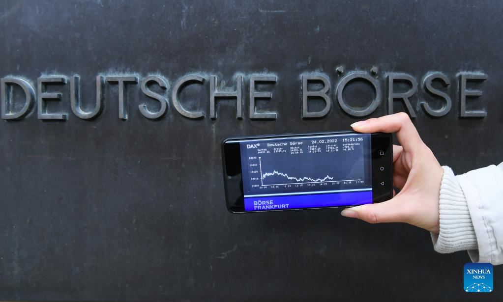 Photo taken on Feb. 24, 2022 shows the DAX index on a mobile phone screen outside the Frankfurt Stock Exchange in Frankfurt, Germany. The German DAX Index opened lower on Thursday after Russia launched military operations in Donbass. (Xinhua/Lu Yang)