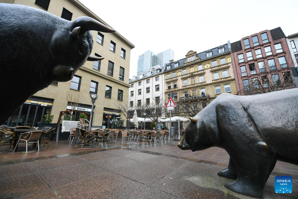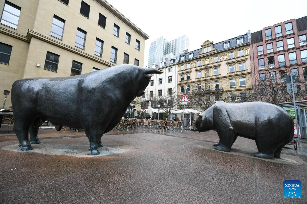 Photo taken on Feb. 24, 2022 shows the Bull and Bear sculptures outside the Frankfurt Stock Exchange in Frankfurt, Germany. The German DAX Index opened lower on Thursday after Russia launched military operations in Donbass. (Xinhua/Lu Yang)