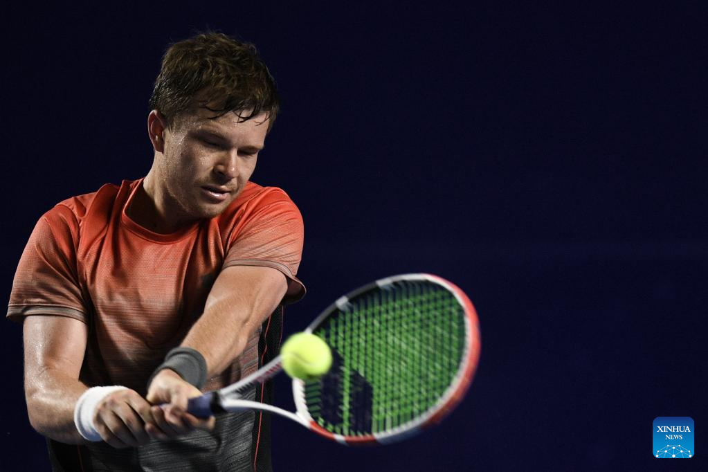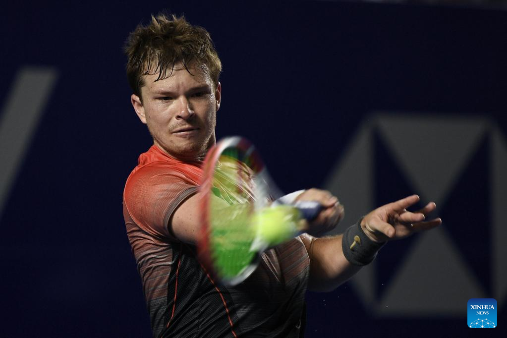 Stefan Kozlov of the United States hits a return during the men's singles round of 16 match against Rafael Nadal of Spain at the 2022 ATP Mexican Open tennis tournament in Acapulco, Mexico, Feb. 23, 2022. (Xinhua/Xin Yuewei)