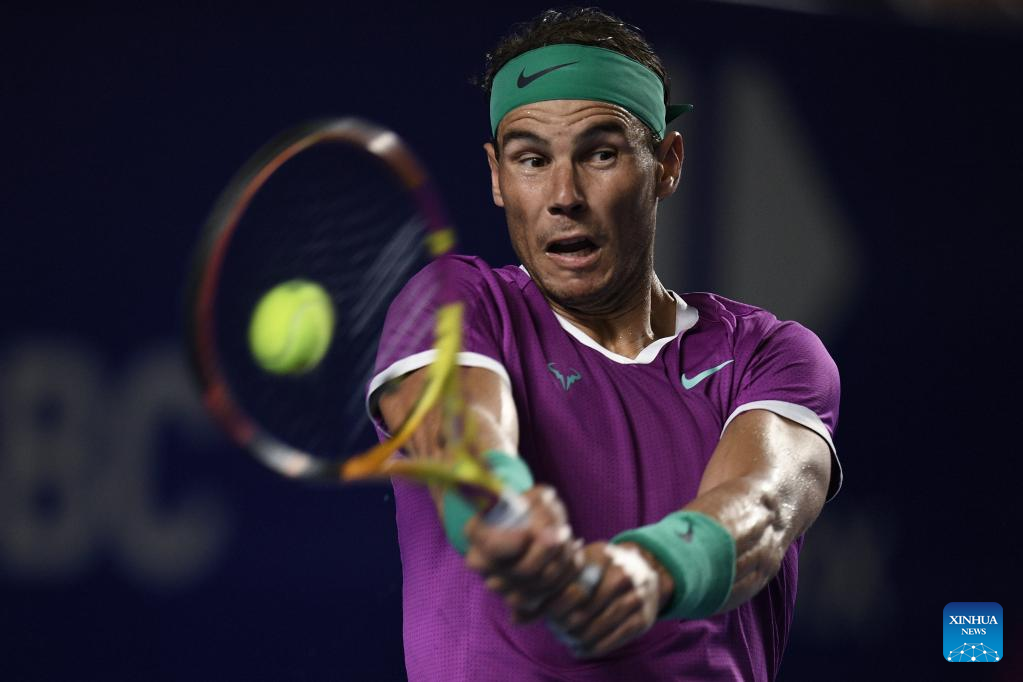 Rafael Nadal of Spain hits a return during the men's singles round of 16 match against Stefan Kozlov of the United States at the 2022 ATP Mexican Open tennis tournament in Acapulco, Mexico, Feb. 23, 2022. (Xinhua/Xin Yuewei)