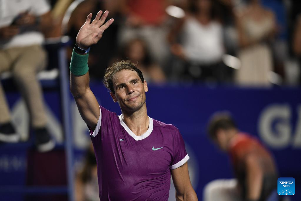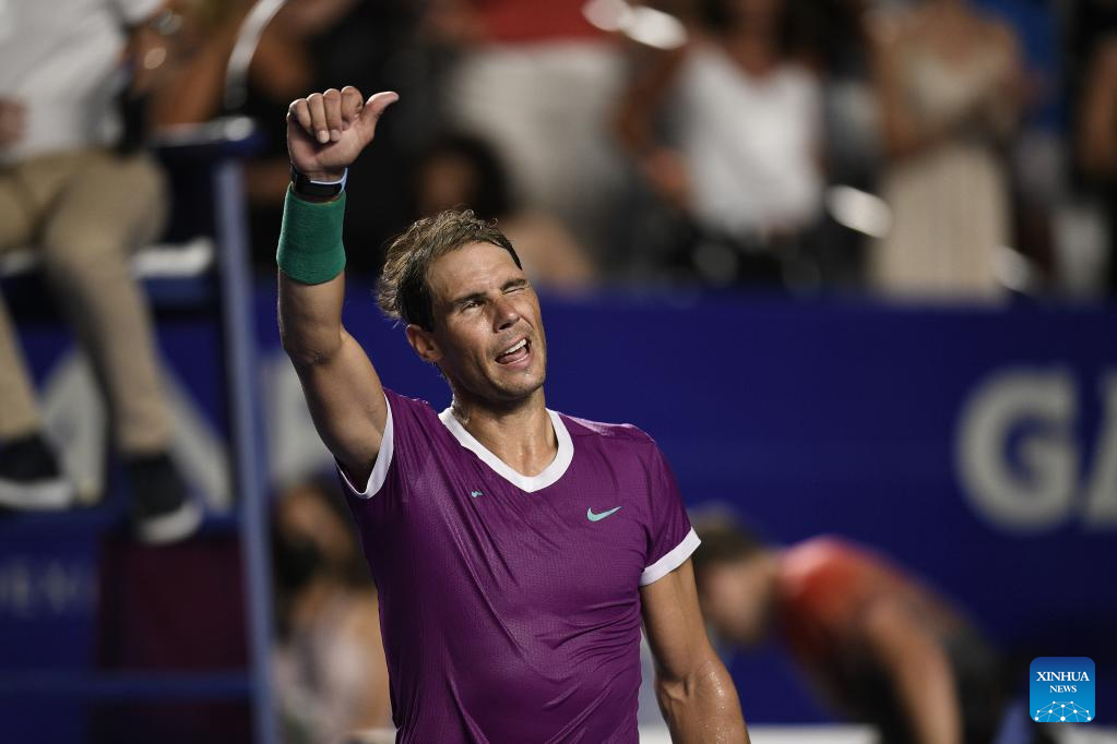 Rafael Nadal of Spain reacts after winning the men's singles round of 16 match against Stefan Kozlov of the United States at the 2022 ATP Mexican Open tennis tournament in Acapulco, Mexico, Feb. 23, 2022. (Xinhua/Xin Yuewei)
