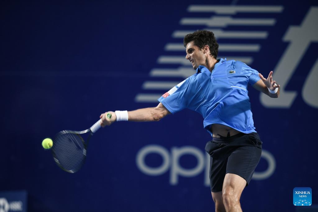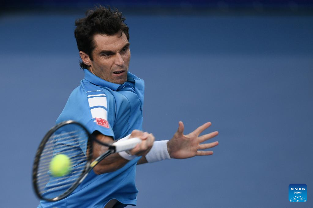 Pablo Andujar of Spain hits a return during the men's singles round of 16 match between Daniil Medvedev of Russia and Pablo Andujar of Spain at the 2022 ATP Mexican Open tennis tournament in Acapulco, Mexico, Feb. 23, 2022. (Xinhua/Xin Yuewei)
