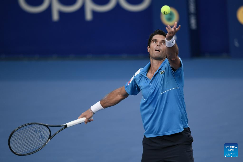 Pablo Andujar of Spain serves during the men's singles round of 16 match between Daniil Medvedev of Russia and Pablo Andujar of Spain at the 2022 ATP Mexican Open tennis tournament in Acapulco, Mexico, Feb. 23, 2022. (Xinhua/Xin Yuewei)