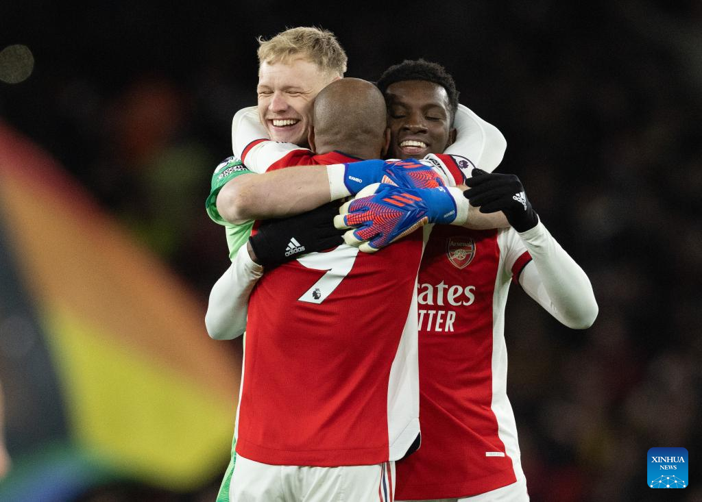 Arsenal's goalkeeper Aaron Ramsdale celebrates after the English Premier League match between Arsenal and Wolverhampton Wanderers in London, Britain, on Feb. 24, 2022. (Xinhua)