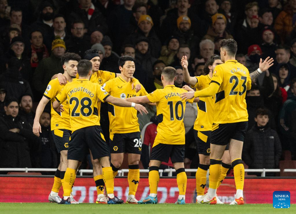 Wolverhampton Wanderers' Hwang Hee-Chan (C) celebrates with teammates after scoring during the English Premier League match between Arsenal and Wolverhampton Wanderers in London, Britain, on Feb. 24, 2022. (Xinhua)