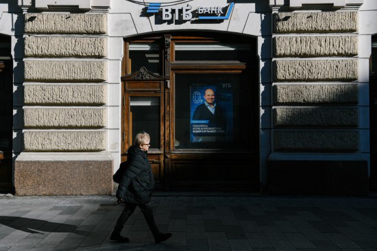 A woman passes by an office of VTB bank in Moscow, Russia, Feb. 25, 2022. As the Ukraine crisis is arousing widespread concerns, the United States, the European Union (EU), and Britain have announced sanctions against Russia for its latest actions. (Xinhua/Evgeny Sinitsyn)