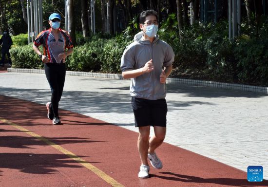 People wearing masks exercise in Hong Kong, south China, Feb. 26, 2022. Hong Kong reported 17,063 new COVID-19 cases on Saturday, official data showed. (Xinhua/Lo Ping Fai)