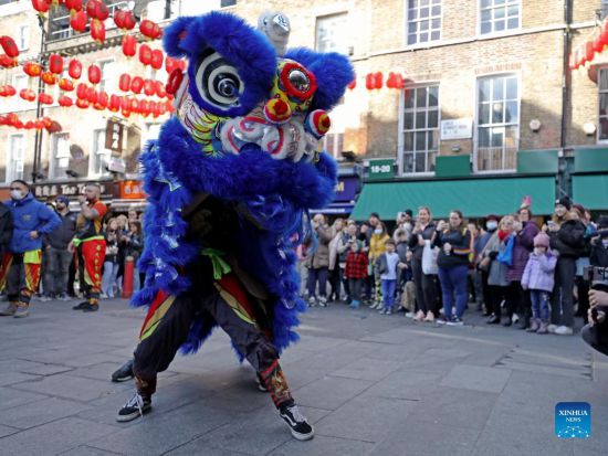 Artists perform a traditional Chinese lion dance after the screening of Chinese animation "I Am What I Am" in London, Britain, on Feb. 26, 2022. Unfolding from a brief introduction to lion dance, a centuries-old Chinese folk dance mostly performed to celebrate Lunar New Year, the movie "I Am What I Am" follows an underdog teenager in Guangdong, southern China, as he joins hands with two friends to pursue a dream against all odds -- becoming the best lion dance performer. (Xinhua/Li Ying)