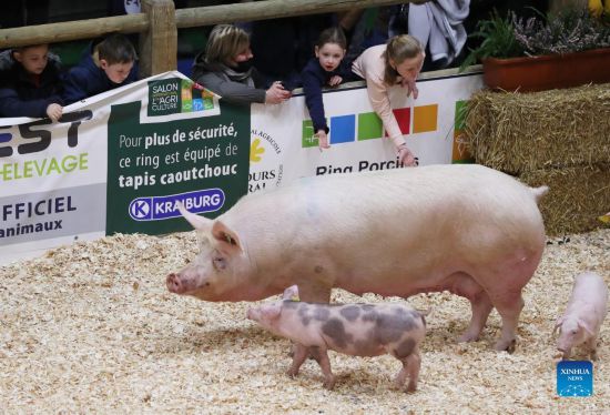 Children interact with pigs during the 58th International Agriculture Fair at the Porte de Versailles exhibition center in Paris, France, Feb. 26, 2022. The fair will last until March 6, 2022. (Xinhua/Gao Jing)