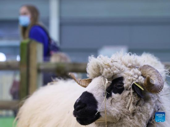 A sheep is seen during the 58th International Agriculture Fair at the Porte de Versailles exhibition center in Paris, France, Feb. 26, 2022. The fair will last until March 6, 2022. (Xinhua/Gao Jing)