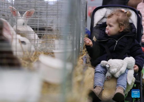 A child visits the 58th International Agriculture Fair at the Porte de Versailles exhibition center in Paris, France, Feb. 26, 2022. The fair will last until March 6, 2022. (Xinhua/Gao Jing)