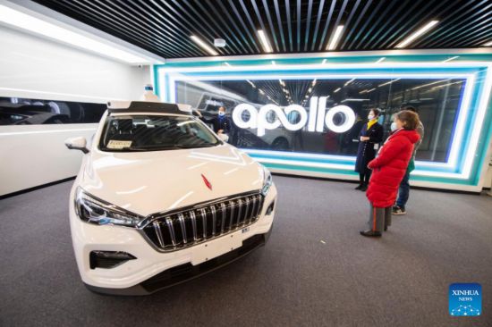 A staff member introduces an unmanned car at Apollo Park in Yangquan, north China's Shanxi Province, Feb. 25, 2022. (Xinhua/Yang Chenguang)