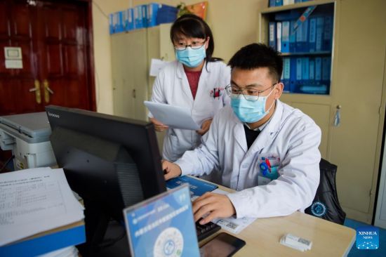 Dcotors enter prescription information of traditional Chinese medicine (TCM) at the Inner Mongolia Autonomous Region Hospital of Traditional Chinese Medicine in Hohhot, north China's Inner Mongolia Autonomous Region, Feb. 25, 2022. Amid the lastest resurgence of COVID-19, the Inner Mongolia Autonomous Region Hospital of Traditional Chinese Medicine has been engaging in the fight against the disease by applying TCM. (Xinhua/Li Zhipeng)