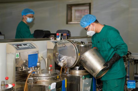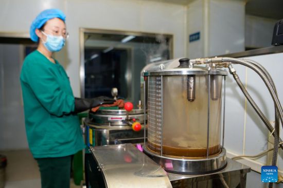 A pharmacist makes traditional Chinese medicine (TCM) at the Inner Mongolia Autonomous Region Hospital of Traditional Chinese Medicine in Hohhot, north China's Inner Mongolia Autonomous Region, Feb. 25, 2022. Amid the lastest resurgence of COVID-19, the Inner Mongolia Autonomous Region Hospital of Traditional Chinese Medicine has been engaging in the fight against the disease by applying TCM. (Xinhua/Li Zhipeng)