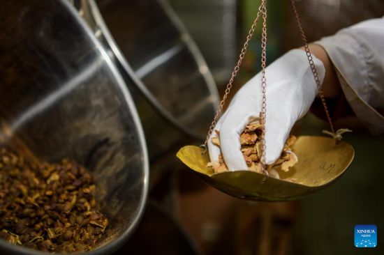 A pharmacist weighs ingredients to produce traditional Chinese medicine (TCM) at the Inner Mongolia Autonomous Region Hospital of Traditional Chinese Medicine in Hohhot, north China's Inner Mongolia Autonomous Region, Feb. 25, 2022. Amid the lastest resurgence of COVID-19, the Inner Mongolia Autonomous Region Hospital of Traditional Chinese Medicine has been engaging in the fight against the disease by applying TCM. (Xinhua/Li Zhipeng)
