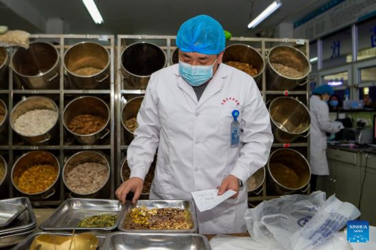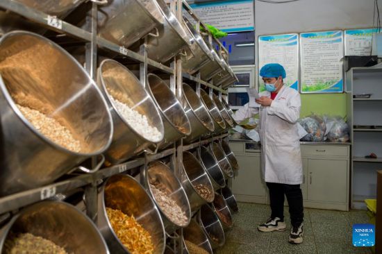 A pharmacist checks ingredients to produce traditional Chinese medicine (TCM) at the Inner Mongolia Autonomous Region Hospital of Traditional Chinese Medicine in Hohhot, north China's Inner Mongolia Autonomous Region, Feb. 25, 2022. Amid the lastest resurgence of COVID-19, the Inner Mongolia Autonomous Region Hospital of Traditional Chinese Medicine has been engaging in the fight against the disease by applying TCM. (Xinhua/Li Zhipeng)