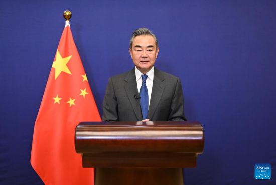 Chinese State Councilor and Foreign Minister Wang Yi attends a UN General Assembly high-level thematic debate titled "Galvanizing Momentum for Universal Vaccination" via video link, Feb. 25, 2022. (Xinhua/Shen Hong)