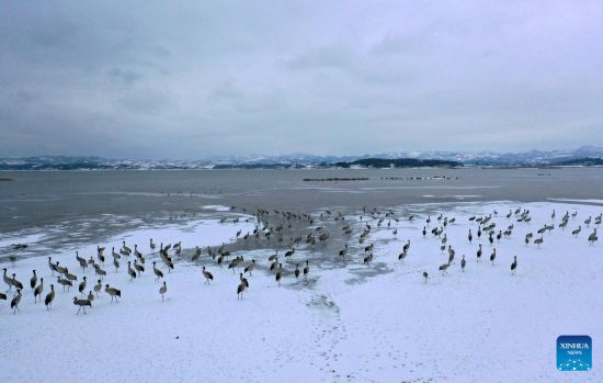 Aerial photo shows black-necked cranes and other migrant birds at the Caohai National Nature Reserve in Weining Yi, Hui and Miao Autonomous County, southwest China's Guizhou Province, Feb. 22, 2022. Caohai was listed as a national nature reserve in 1992 and is an important wintering ground and migration transfer station for birds such as black-necked cranes, grey cranes and spotted geese. (Photo by He Huan/Xinhua)