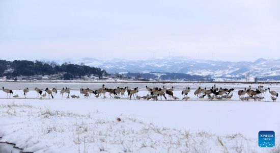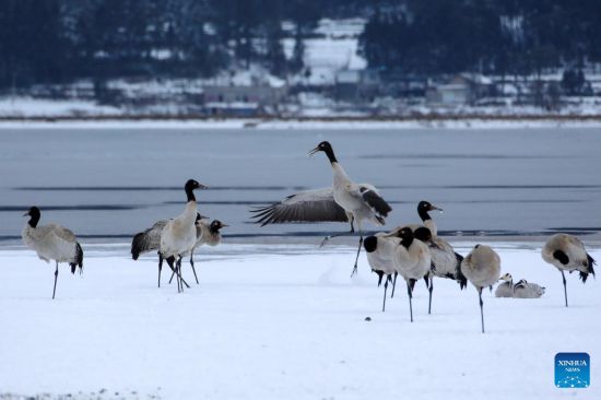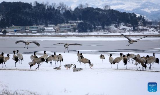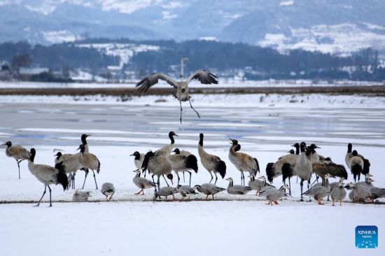 Black-necked cranes and other migrant birds are seen at the Caohai National Nature Reserve in Weining Yi, Hui and Miao Autonomous County, southwest China's Guizhou Province, Feb. 22, 2022. Caohai was listed as a national nature reserve in 1992 and is an important wintering ground and migration transfer station for birds such as black-necked cranes, grey cranes and spotted geese. (Photo by He Huan/Xinhua)