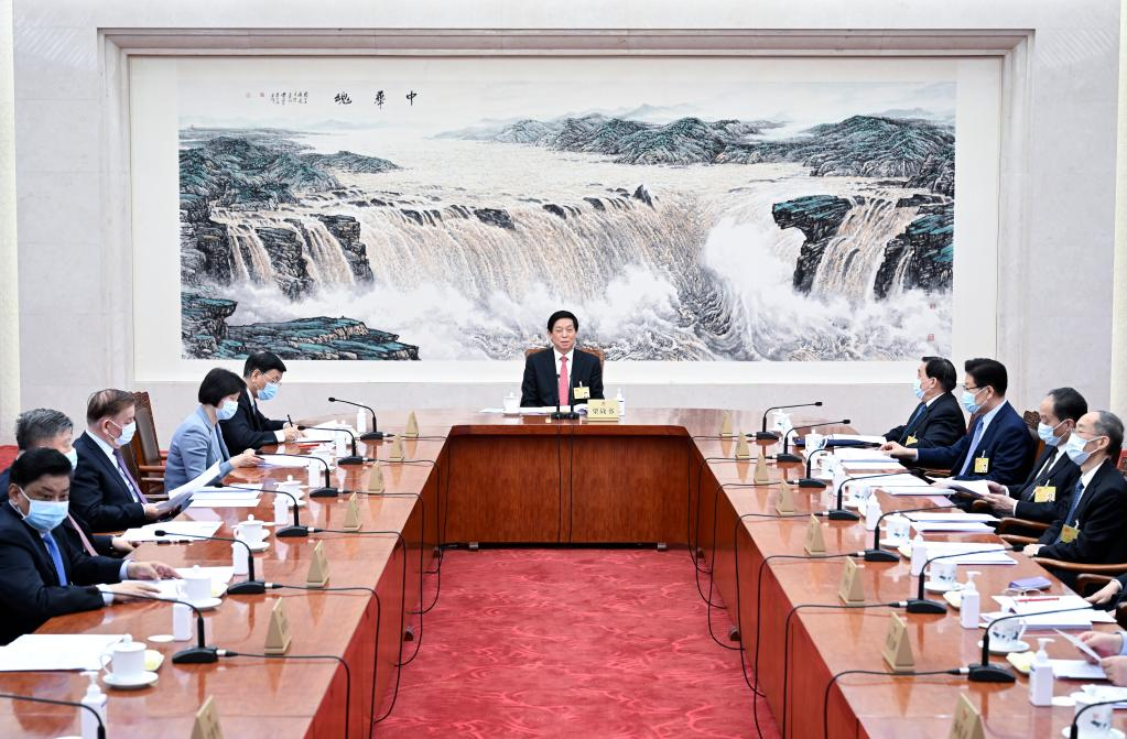 Li Zhanshu, chairman of the National People's Congress (NPC) Standing Committee, presides over the 110th meeting of the Council of Chairpersons of the 13th NPC Standing Committee at the Great Hall of the People in Beijing, capital of China, Feb. 27, 2022. (Xinhua/Zhang Ling)