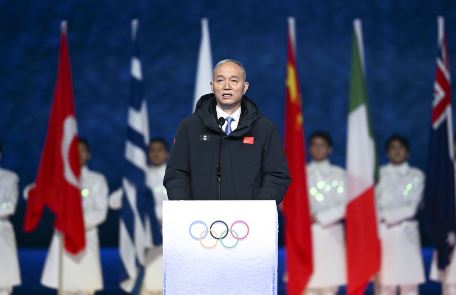 Cai Qi, president of the Beijing Organizing Committee for the 2022 Olympic and Paralympic Winter Games (BOCOG), addresses the closing ceremony of the Beijing 2022 Olympic Winter Games at the National Stadium in Beijing, capital of China, Feb. 20, 2022. during the closing ceremony of the Beijing 2022 Olympic Winter Games at the National Stadium in Beijing, capital of China, Feb. 20, 2022. (Xinhua/Li Ga)