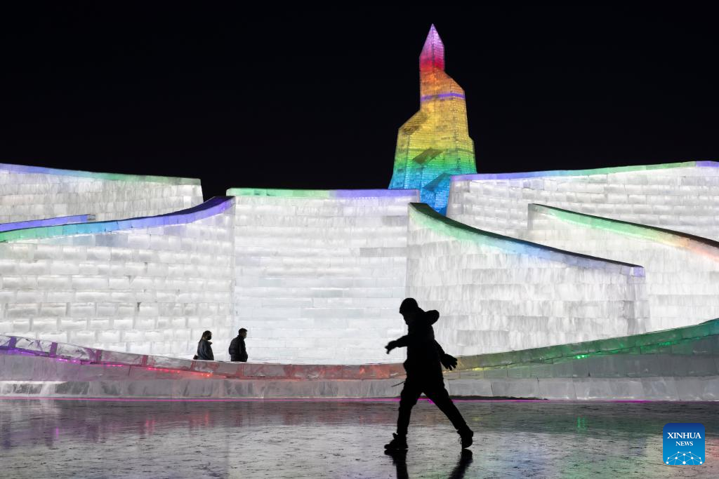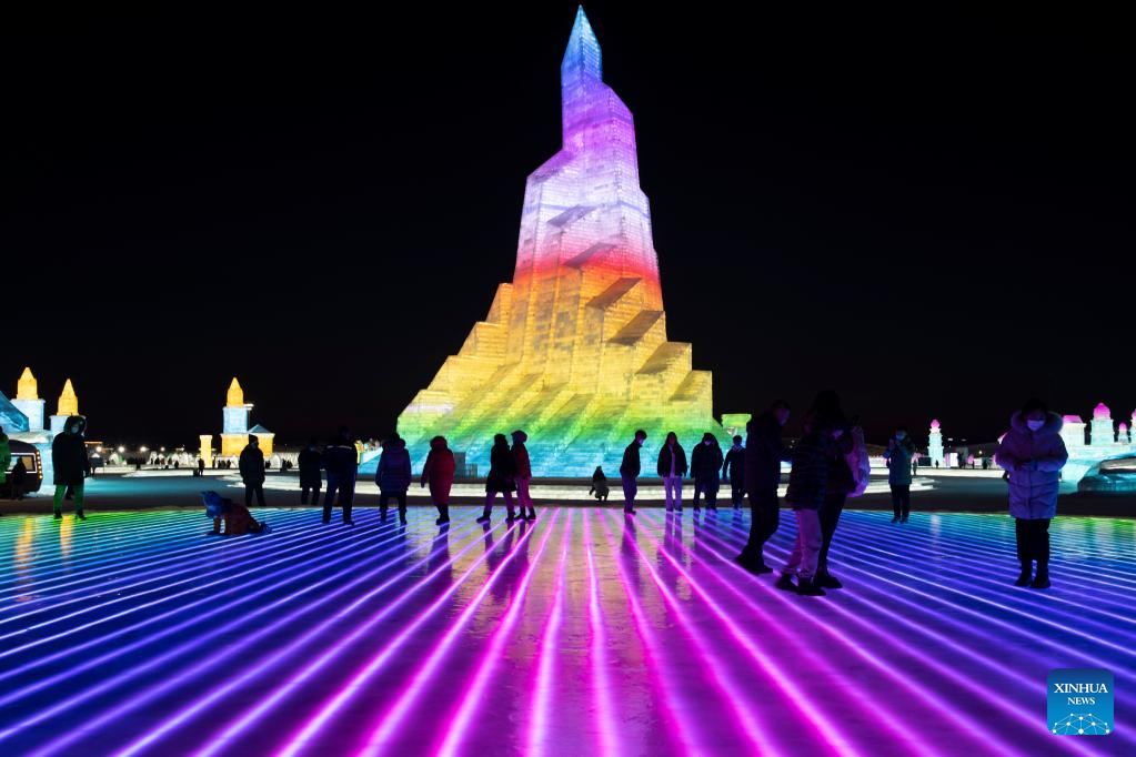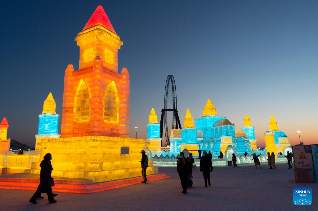 Tourists visit the Harbin Ice-Snow World in Harbin, northeast China's Heilongjiang Province, Feb. 27, 2022. The 23rd Harbin Ice-Snow World closed on Sunday. (Xinhua/Zhang Tao)