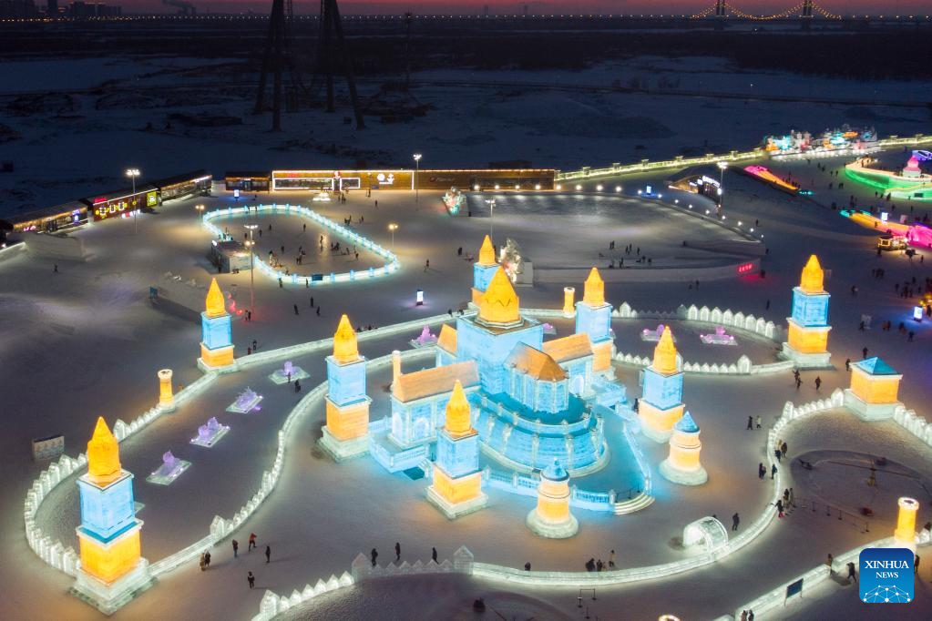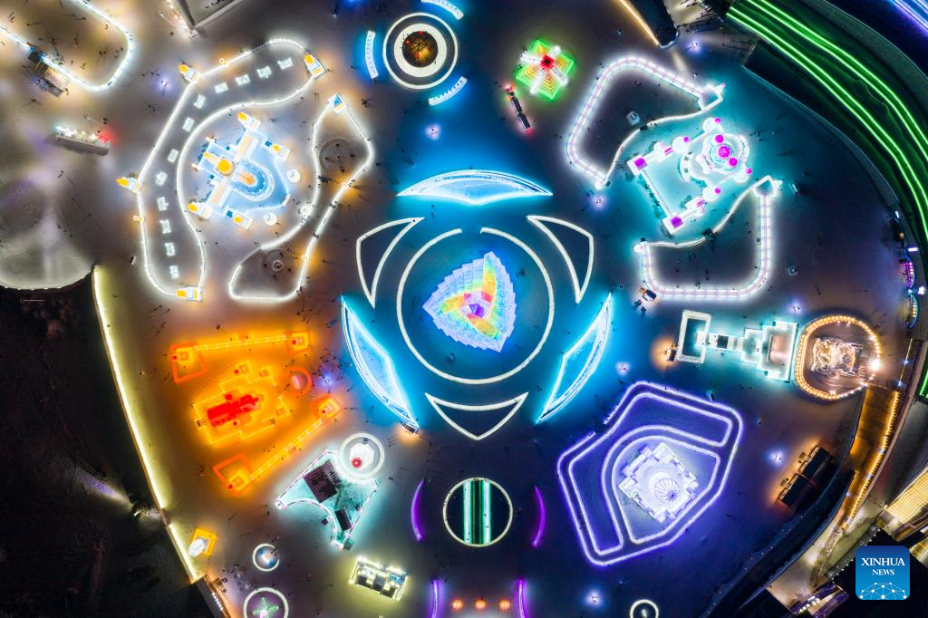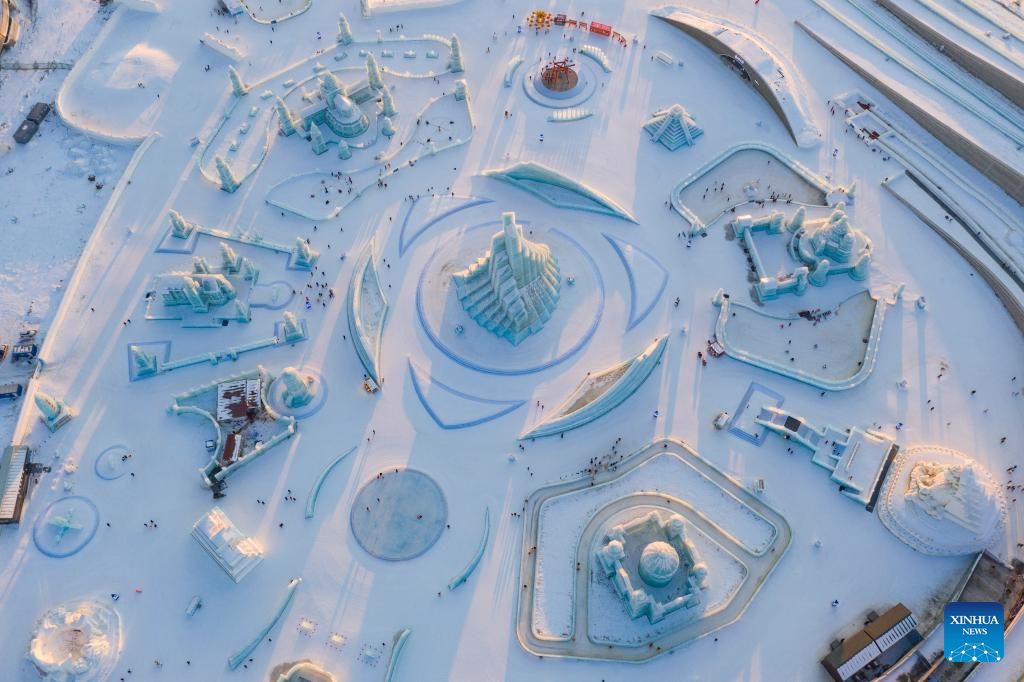Aerial photo shows tourists visiting the Harbin Ice-Snow World in Harbin, northeast China's Heilongjiang Province, Feb. 27, 2022. The 23rd Harbin Ice-Snow World closed on Sunday. (Xinhua/Xie Jianfei)