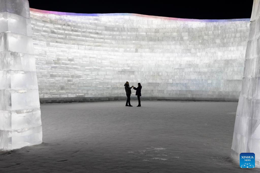 Tourists pose for photo at the Harbin Ice-Snow World in Harbin, northeast China's Heilongjiang Province, Feb. 27, 2022. The 23rd Harbin Ice-Snow World closed on Sunday. (Xinhua/Zhang Tao)