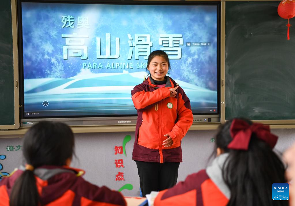 Member of the "Dieyun" ski team Wang Xinyue shares her experience in skiing with classmates at the special education school in Xindu District of Chengdu, southwest China's Sichuan Province, Feb. 25, 2022. When seeing the boys and girls skiing down the slope, no one will realize they are anything different from other ski-loving youngsters until noticing their coach communicating with them mainly through writing and gesturing.