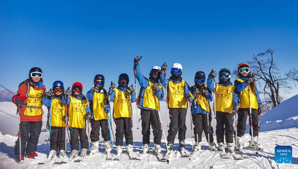 Members of the "Dieyun" ski team pose for a group photo at a Ski Resort in Maoxian County of Aba Tibetan and Qiang Autonomous Prefecture, southwest China's Sichuan Province, Dec. 24, 2019. When seeing the boys and girls skiing down the slope, no one will realize they are anything different from other ski-loving youngsters until noticing their coach communicating with them mainly through writing and gesturing.